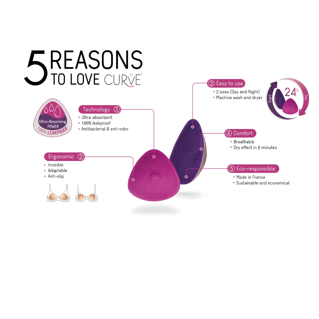 Curve nursing pads fit into any bra, its shape is designed to fit your bra. It naturally follows the shape of your breasts for a perfect grip and comfort.