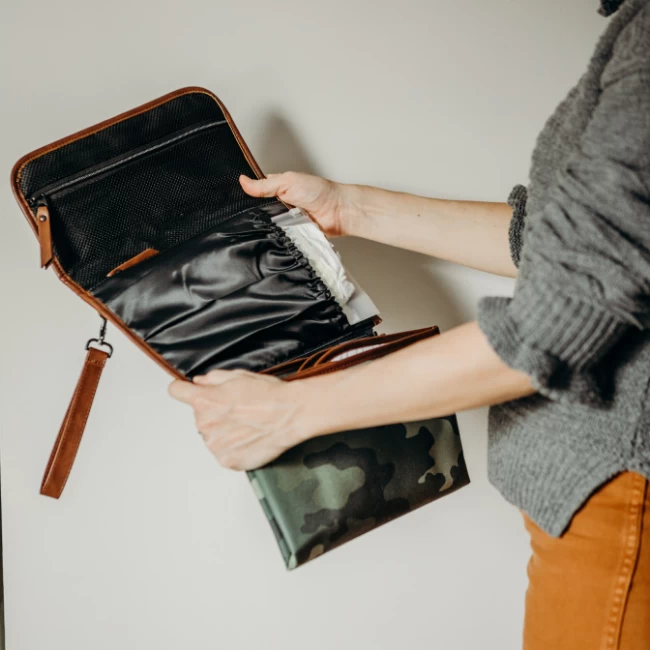 This essential accessory is an all-in-one portable changing clutch for your “in a clutch” moments on the go. Because you have enough to carry, this all-in-one portable changing mat is complete with pockets and pouches to hold all your essentials. Wear it as a cute wristlet or toss it in your bag. You’ll love yourself for being so prepared. The premium canvas fabric lends a luxuriously chic touch.