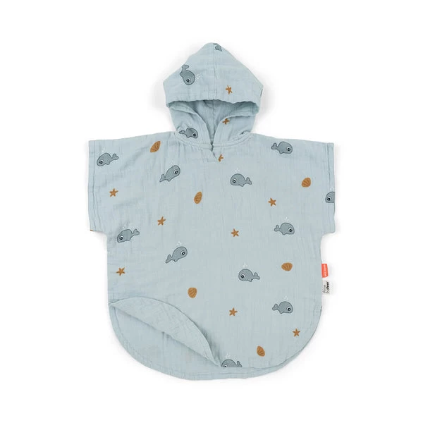 The blue kids’ beach poncho is decorated with our Sea friend Wally the whale together with cute ocean elements; shells, coral reef and sea stars in tones of blue and mustard.