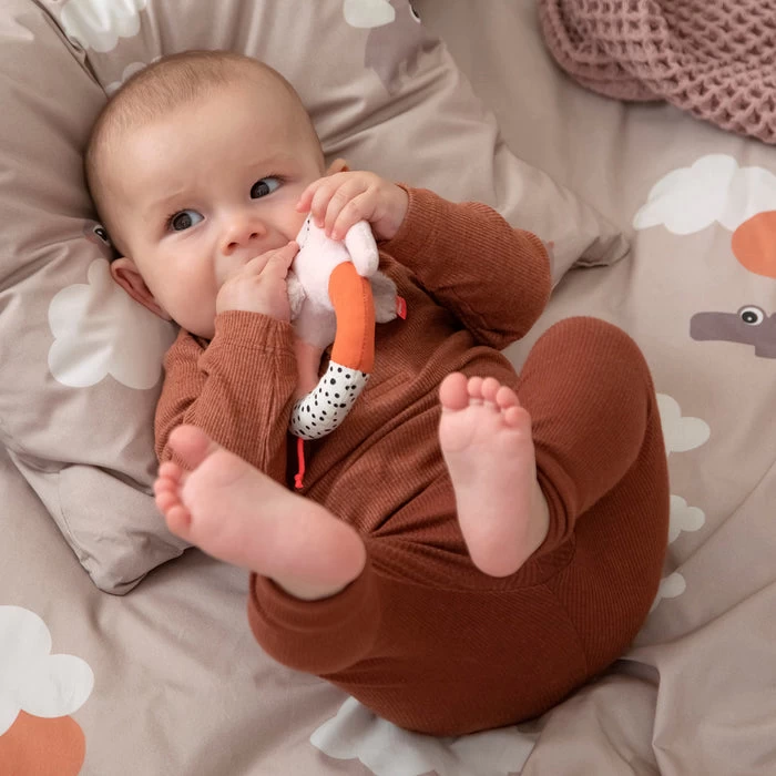 Little ones will enjoy a fun playtime with Elphee. The ring rattle has powder, coral, and papaya coloured elements and an element with playful dots.