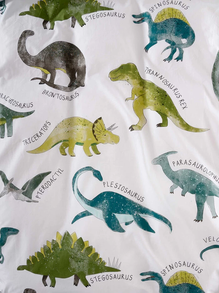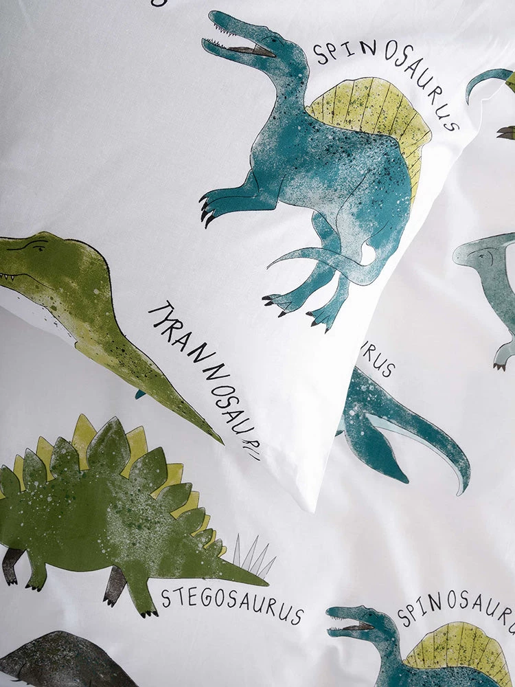 Bring your little dinosaur-enthusiasts imagination to life with this awesome design. These watercoloured dinosaurs are easy to identify with their names spelt across the duvet cover, in bold splashes of tonal greens and teals on a fresh white ground. This design is printed on cotton with the same print front and reverse.