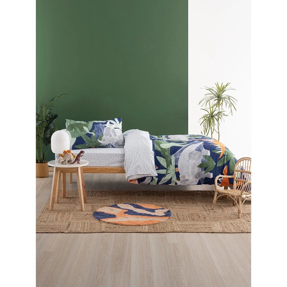 With the Linen House Wild Jurassic Duvet Cover Set you can take a walk through history! Hand-illustrated in rich, earthy colours on a deep navy ground, Wild Jurassic features all of your favourite dinosaurs – triceratops, tyrannosaurus rex, brontosaurus and more! Printed on cotton, this set reverses to a geometric cross print.