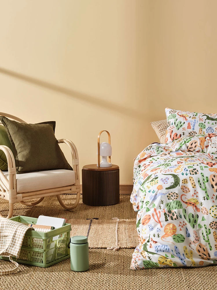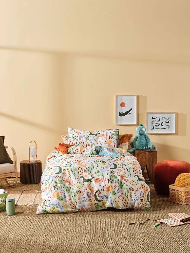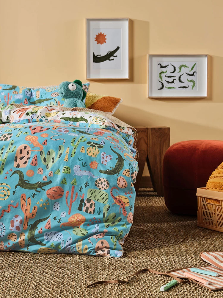 Sunbake like a frilled-neck lizard or curl up in snake style. Tales and Scales is a vibrant reptile print on cotton percale illustrated with lizards, crocodiles and snakes. This fully reversible set with cord piping trim will thrill your little amphibian.