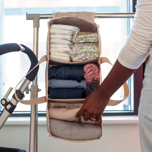 Made from recycled materials. This wheeled hospital bag comes with a patented hanging organiser system. Allowing you to pack, hang up and use without unpacking. A perfect hospital or travel bag, that will keep you organised on short trips.