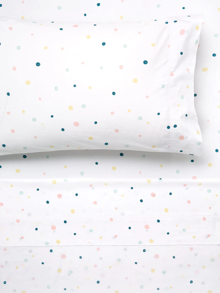 Fun-filled and eye-catching, this 225 thread count cotton sheet set features a multi-colored, textured spot print on white with a printed cuff and cord piping header, which will coordinate beautifully with many of our delightful Hiccups quilt covers set designs, most especially our Llama Party quilt cover set.