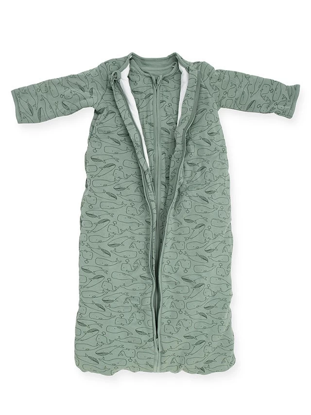 This is the perfect sleeping bag for your baby. You can easily transform it from a winter sleeping bag into a summer sleeping bag thanks to the removable sleeping bag on the inside. The two parts are attached to each other with press studs. The friendly whales print is subtle and the sleeping bag feels nice and soft. This way you ensure warm and comfortable nights and your baby is calm. The freedom of movement is limited by a sleeping bag and that gives your baby a safe feeling. Available in 3 sizes and 2 colors.
