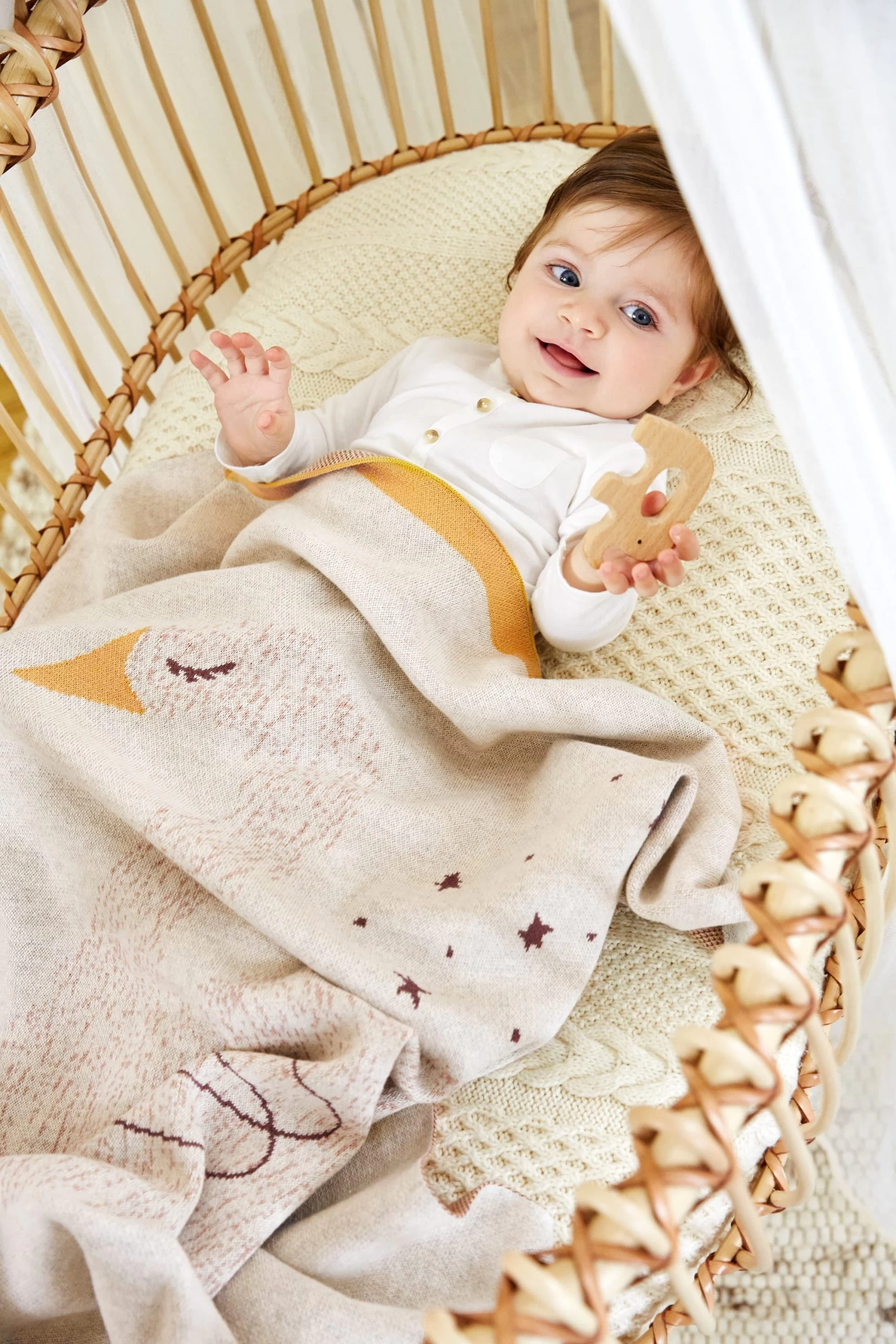 This gorgeous, blissfully soft knitted blanket, size 75 x 100 cm, never fails to delight parents with its multitude of uses for babies: as a base for a change of diapers, to crawl and play on, as a cot cover, or simply and best – just to snuggle up in!