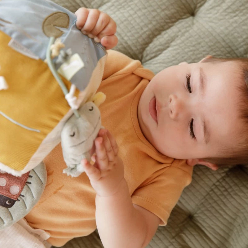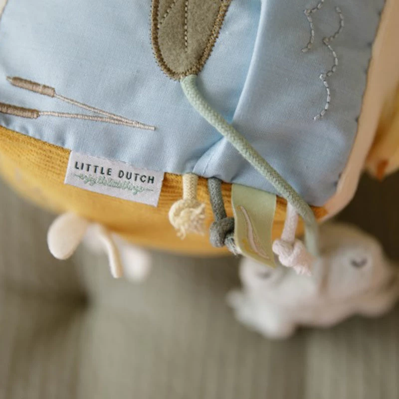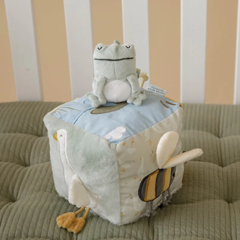 Little Goose and Friends’s Soft Cube contains many activities that stimulate babies’ senses. There is so much to discover and play with: various labels, different textures, a mirror and a rattle that make a sound with every movement. There is also a little frog that likes to play hide and seek. This toy remains interesting and provides a lot of fun in the box.