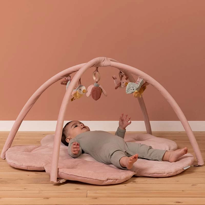 So much to see, feel and hear. Every day is a new adventure with this flower shaped play mat. The pink rug has two large corduroy bows with 5 different cuddly toys hanging from it. The bird, sparrow, flower and butterflies help little ones develop sensory skills and stimulate hand-eye coordination.