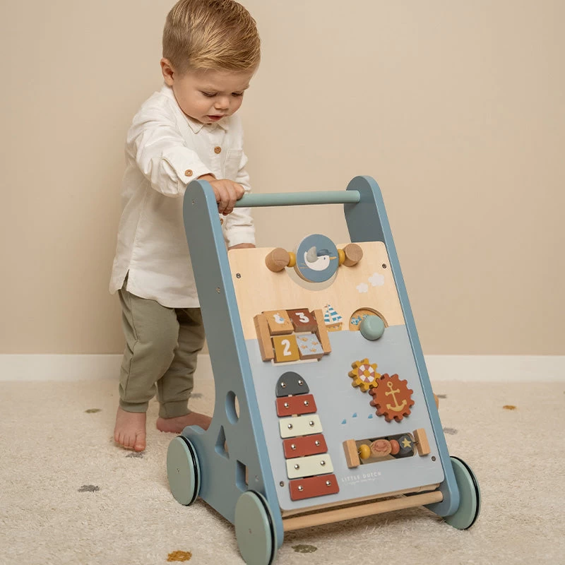 This wooden activity walker offers various challenging activities that support the development of your child’s motor skills. There are 8 activities to explore and master.