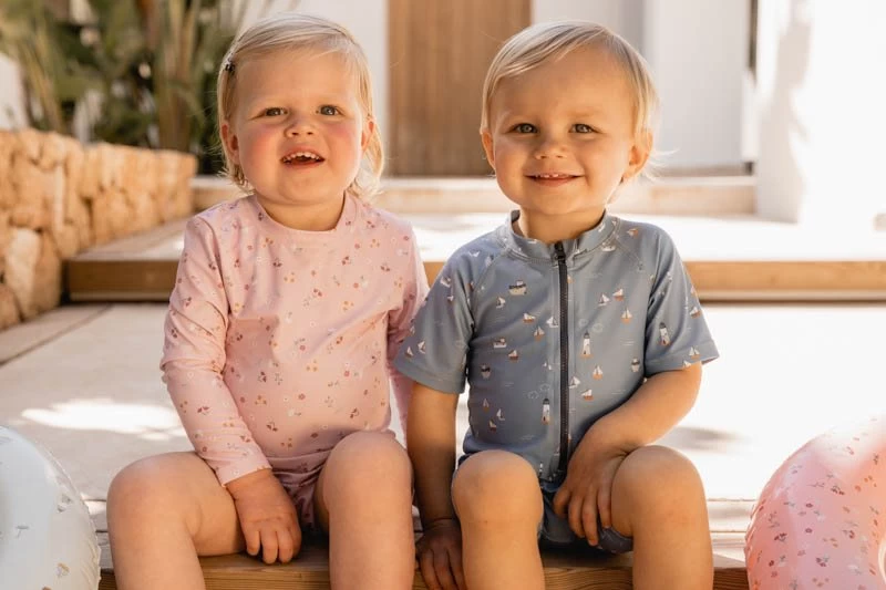 Are you ready to get active in the water? This long-sleeved swimsuit of recycled polyester will keep you warm in the water and protects you from the sun while you play all day long. Whether you love to surf the water or float around in a swim ring, this one-piece suit is the perfect choice for summer activities at the seashore. In blue and covered with the Daisies design, this long-sleeved swimsuit with ruffles at the bottom is not just pretty, it’s comfortable and practical too with the zipper on the back. It is made from UV protective fabric and is available in sizes 62/68, 74/80, 86/92 and 98/104. Pair with a beach poncho and a swim ring and you have all the essentials you need for the beach. Don’t forget to always use sunscreen lotions to protect your little one.
