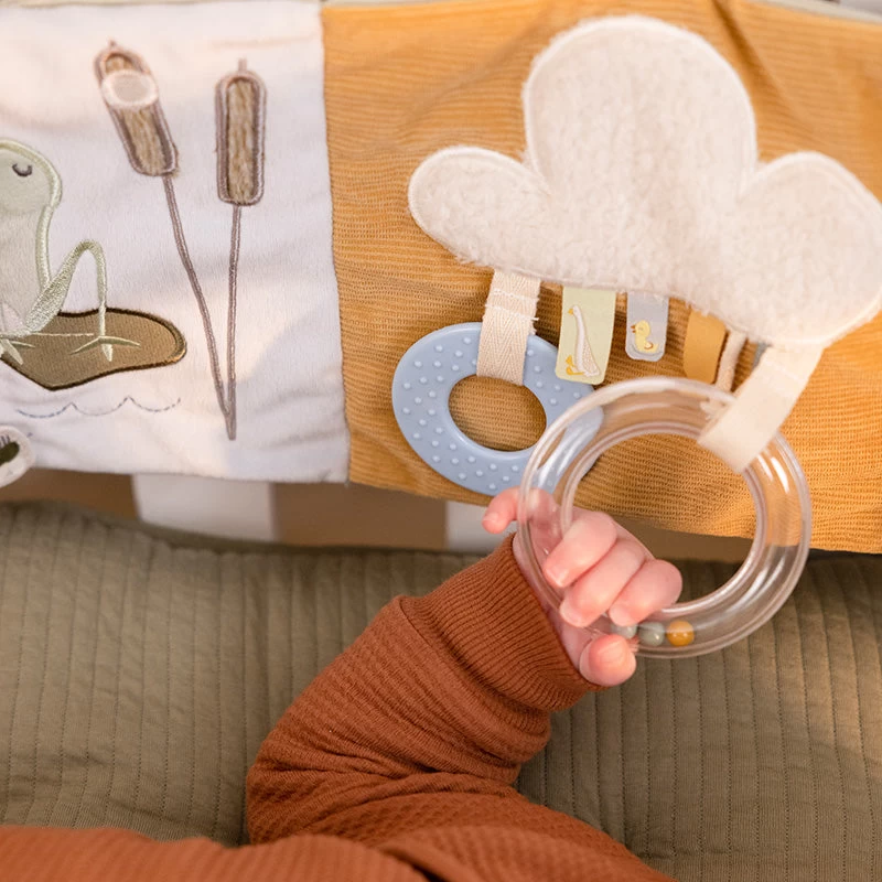It’s playtime in the playpen! Discover Little Goose and all his friends with this cute playpen activity book. Made of different materials to touch and feel with lots of activities to explore. Look for the mirror behind the ladybug! Give the rattling little bee a swing! And feel the surface of the teething ring!