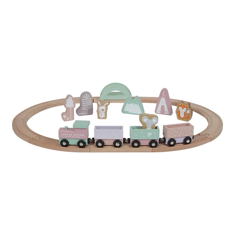 Cheerful train set from Little Dutch, includes a locomotive, 3 wagons, a train track and several figures. Enjoy your ride!