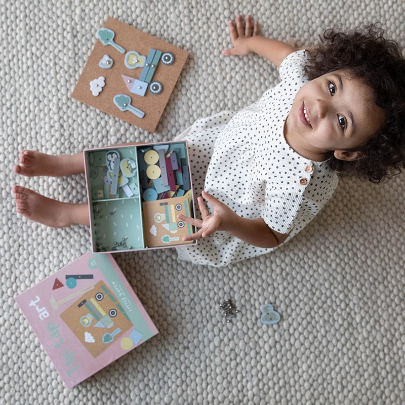 With this hammer-tapping game from Little Dutch, children from 3 years old can happily work on it. The set contains a combination of wooden geometric shapes and illustrated figures of high-quality cardboard. Children can let their imaginations run wild and create the most beautiful fantasy scenes. The game consists of a cork base, a wooden hammer, various figures of wood and cardboard, 4 examples and 70 nails.