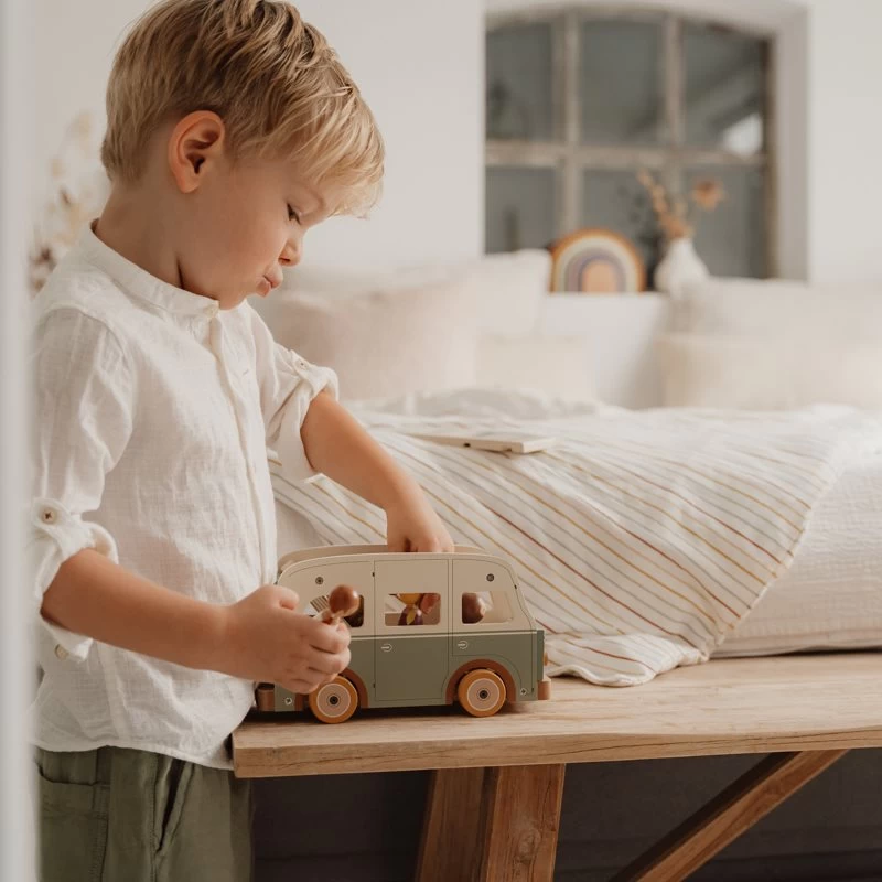 Don’t forget to bring your suitcase, beach bag and surfboard! The roof of this vintage wooden camper can be removed, so the 4 wooden figurines easily fit inside.