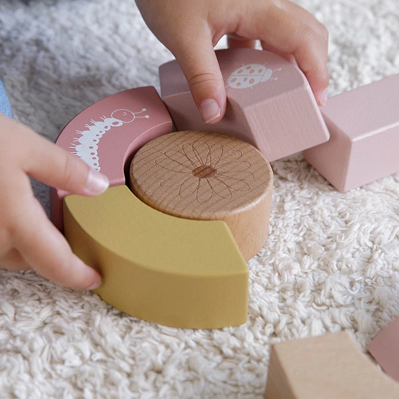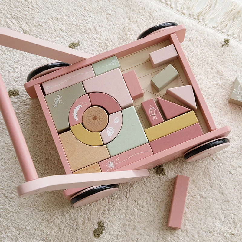 The block trolley has wooden wheels and is filled with colored wooden blocks with beautiful drawings of flowers and insects from the Wild Flowers collection. The different sizes of the blocks promote the recognition of colors and shapes by children.