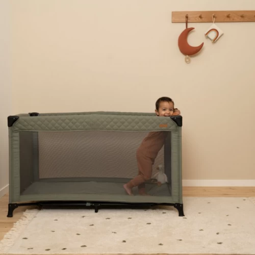 Easy on the way. If you are going for a long or short trip, bring one of our travel beds to make sure your child can have a sleep during your stay. The travel cot is easy and compact to fold. It comes in a bag that can be brought along when you are on the way. Thanks to the mesh fabric on the long sides, your child can look around and air circulation is ensured. The hatch on the end of the bed allows your little one to crawl into the bed independently to avoid backache. The black frame and black mesh fabric give it an extra touch of style.