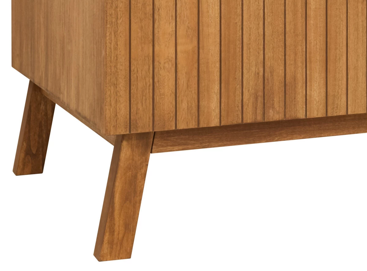 This 2-door wardrobe from the Senna series features sophisticated vertical grooves in the doors and stands on angled legs. The handles are made of leather. The wardrobe is finished with a water-based lacquer, giving it a warm appearance. Behind the doors are three height-adjustable shelves and a hanging rod.